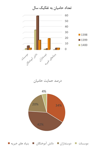 مدیر عامل بنیاد حامیان در بخشی از سخنان خود به میزان کمکها و هدایای جذب شده اشاره و تاکید کرد: کمیت منابع جذب شده اهمیت دارد ولی آنچه که مهمتر است تعداد افرادی است که با بنیاد حامیان ارتباط دارند و در حد توان خود کمک میکنند. وی با اشاره به یکی از تازه فارغالتحصیلان که عهدهدار کمک هزینه تحصیلی یک نفر شده است، توسعه روزافزون ارتباط با دانشآموختگان و خیرین و دریافت کمکهای مادی و معنوی ایشان را یکی از اهداف بنیاد حامیان دانست. در همین راستا، فعالیتهای صورت گرفته در شبکههای اجتماعی در شش ماهه نخست سال ۱۴۰۰ با رشد قابل توجهی روبرو بوده است. لازم به ذکر است که حدود ۴۰ درصد از هدایا و کمکهای جذب شده تاکنون توسط دانشآموختگان دانشگاه هدیه شده و درصد آن در میان همه افرادی که به دانشگاه کمک کردهاند، بیش از ۶۰ درصد است.